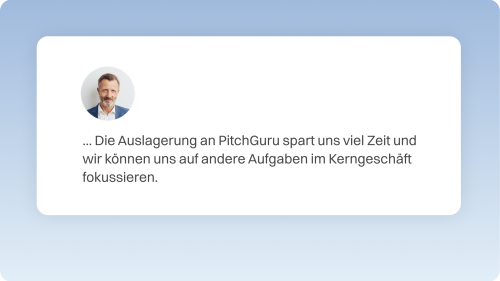 „Präsentationen sind ein zentraler Bestandteil in unserem Geschäft. In der Vergangenheit war es häufig so, dass wir viel Zeit und interne Ressourcen für Präsentationen aufwenden mussten und sich dadurch die Bearbeitung in die Länge gezogen hat. Durch die Zusammenarbeit mit PitchGuru sparen wir uns viel Zeit und erhalten verlässlich innerhalb kürzester Zeit professionell designte Präsentationen. So können wir auch enge Deadlines einhalten und den internen Ressourceneinsatz dabei stark reduzieren.“